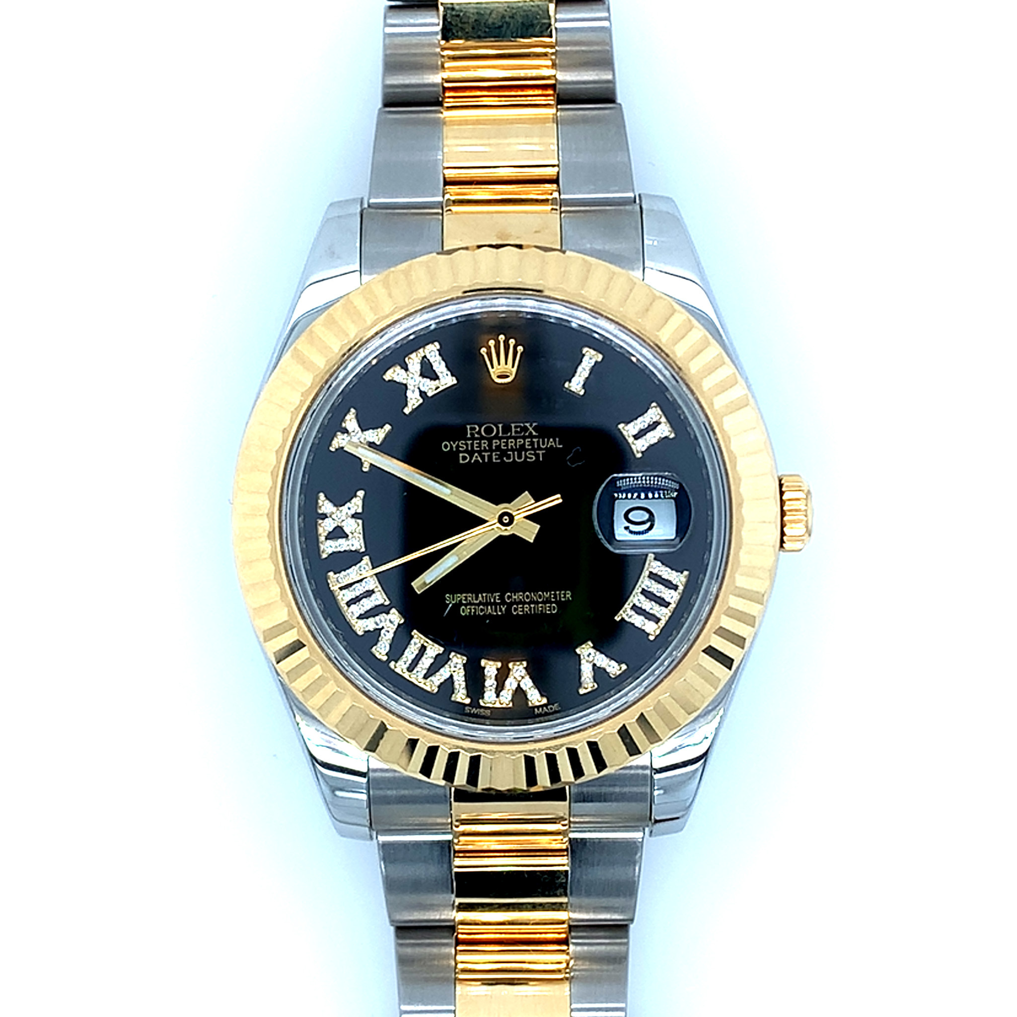 ROLEX TWO TONE OYSTER PERPETUAL DATEJUST 5CT F-G VS DIAMOND BEZEL 41MM BLACK DIAL ROMAN NUMERALS OYSTER BAND 116333 PRE-OWN