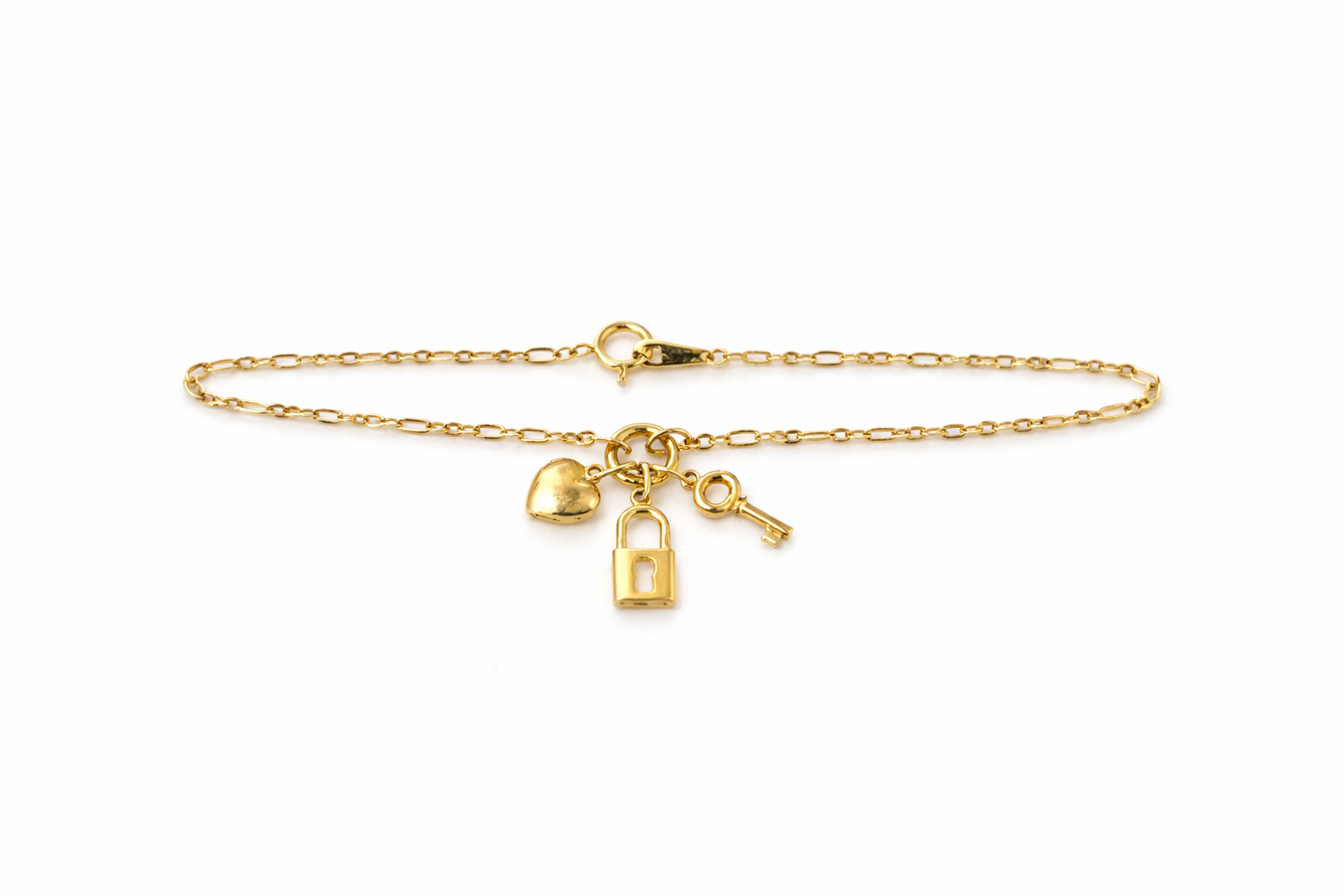 14K YELLOW GOLD HEART KEY LOCK CHARM FIGARO LINK BRACELET