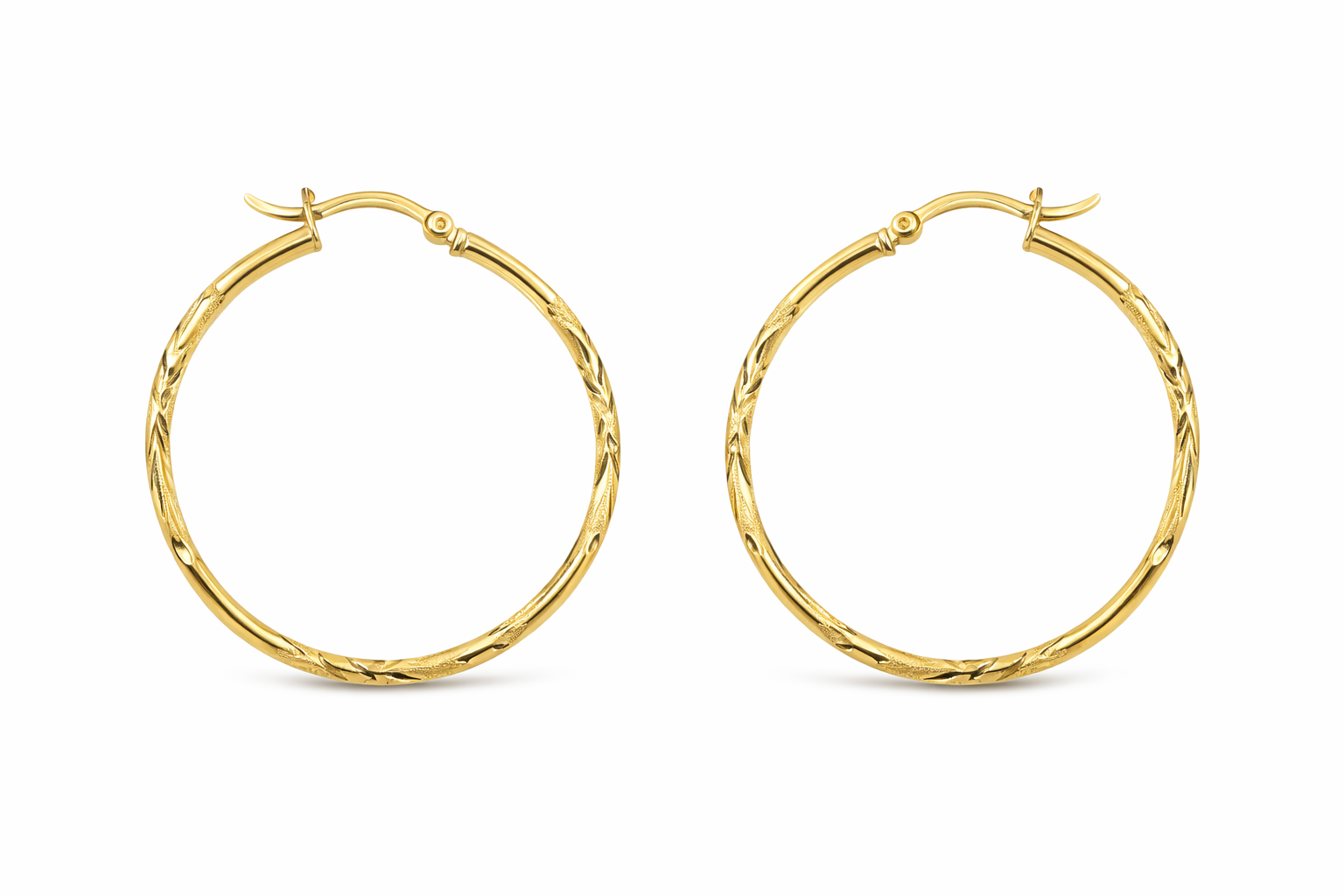 These 14K yellow gold tube hoop earrings feature a refined blend of textures for a sophisticated and versatile look. Crafted in solid 14K yellow gold, each 1.45-inch hoop showcases a subtle satin finish enhanced with diamond-cut detailing that catches the light beautifully.
