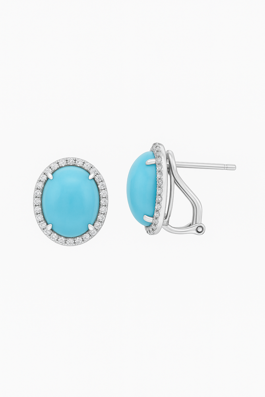 31568 14K WHITE GOLD .40CT DIAMOND HALO TURQUOISE OVAL CABOCHON CUT OMEGA CLASP EARRINGS