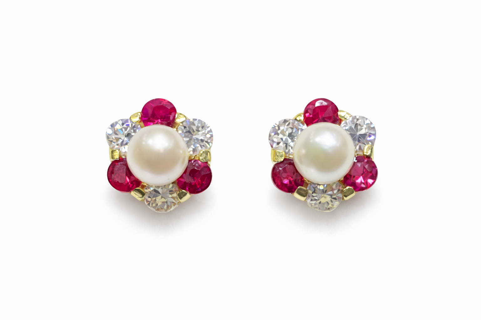 31682 14K YELLOW GOLD PINK AND WHITE CUBIC ZIRCONIA PERL CENTER FLOWER SCREW BACK STUDS