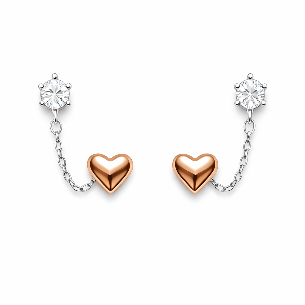 31689 14K WHITE GOLD CUBIC ZIRCONIA CHAINED ROSE-GOLD HEART STUDS