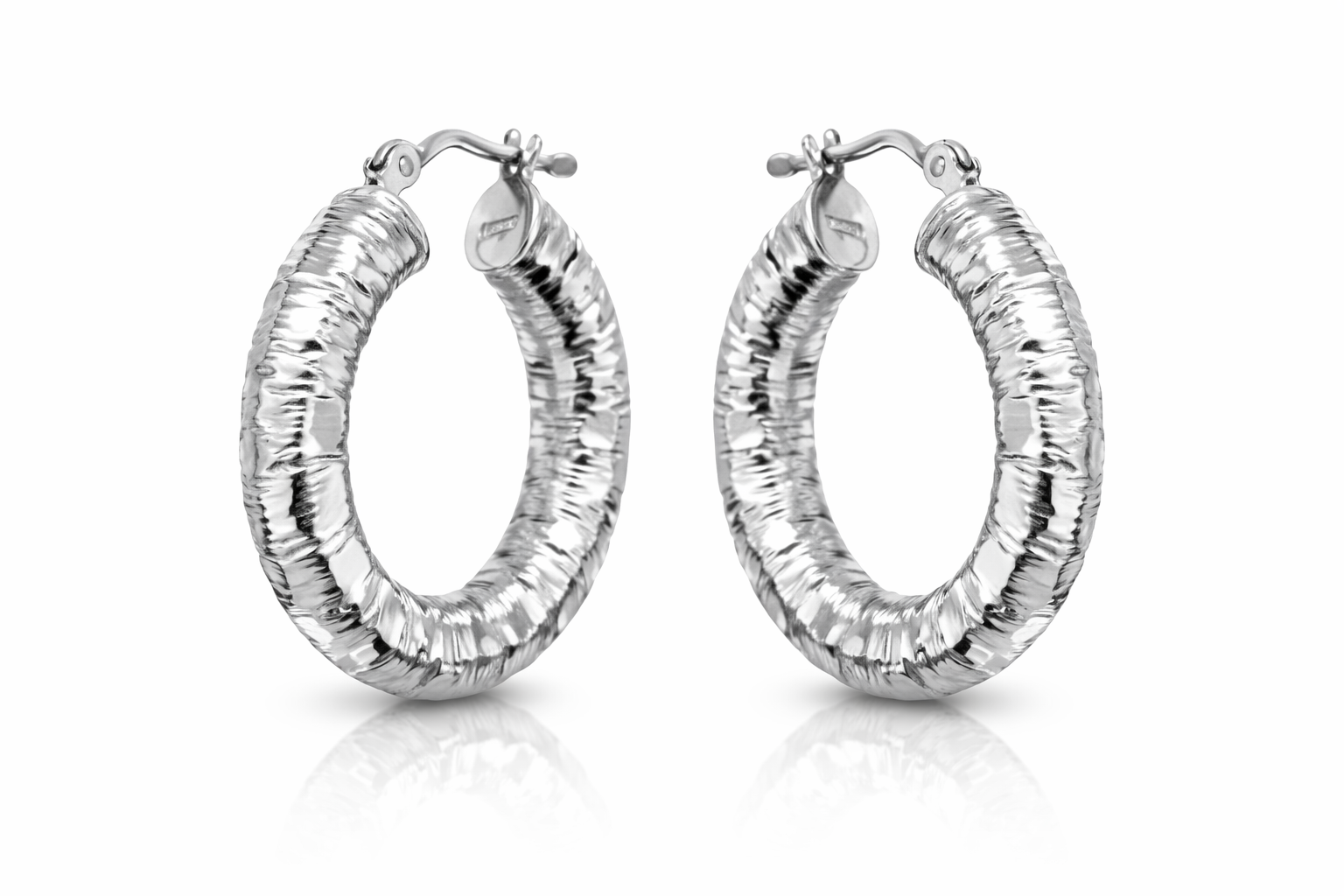 These refined 18K white gold hoop earrings feature a beautifully textured diamond cut hammered finish that delivers exceptional shine and depth. Crafted in solid 18K white gold, each hoop showcases a handcrafted hammered surface that reflects light from every angle, creating a bold yet elegant statement.
