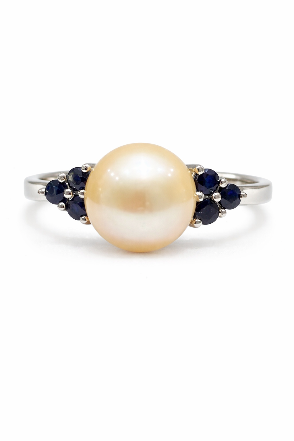 Graceful and timeless, this 14K white gold pearl and sapphire ring showcases a luminous peach pearl measuring approximately 8.85mm as its stunning centerpiece. The pearl’s warm, natural glow is beautifully complemented by deep blue sapphire accents, set delicately on each side for added color and sophistication.