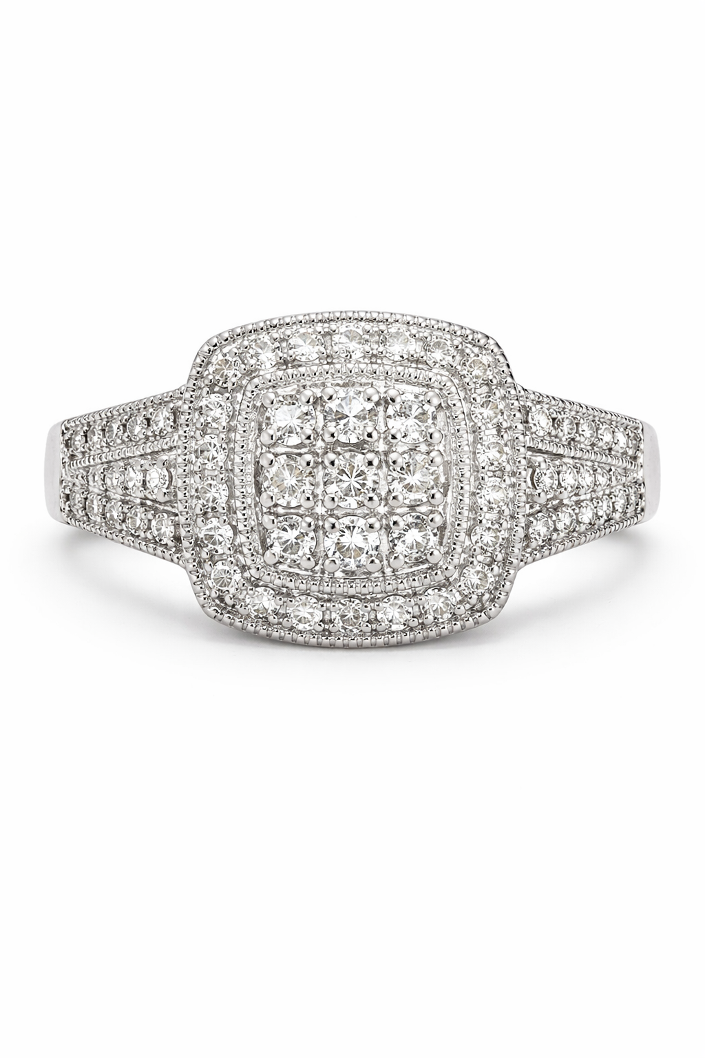 This 10K white gold ring features a cushion-shaped diamond cluster totaling 0.40 carats, designed to maximize sparkle and presence. The center cluster is framed by a diamond halo that enhances brilliance and gives the ring a fuller, eye-catching look.