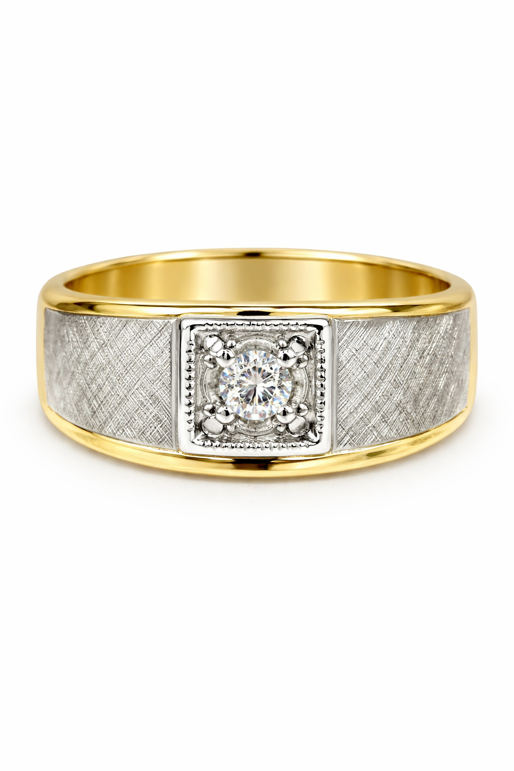 This 14K two-tone men’s ring features a refined design highlighted by a 0.20 carat round diamond set in a square center frame. The diamond is securely held and accented by a subtle milgrain-style border, adding depth and character to the centerpiece.