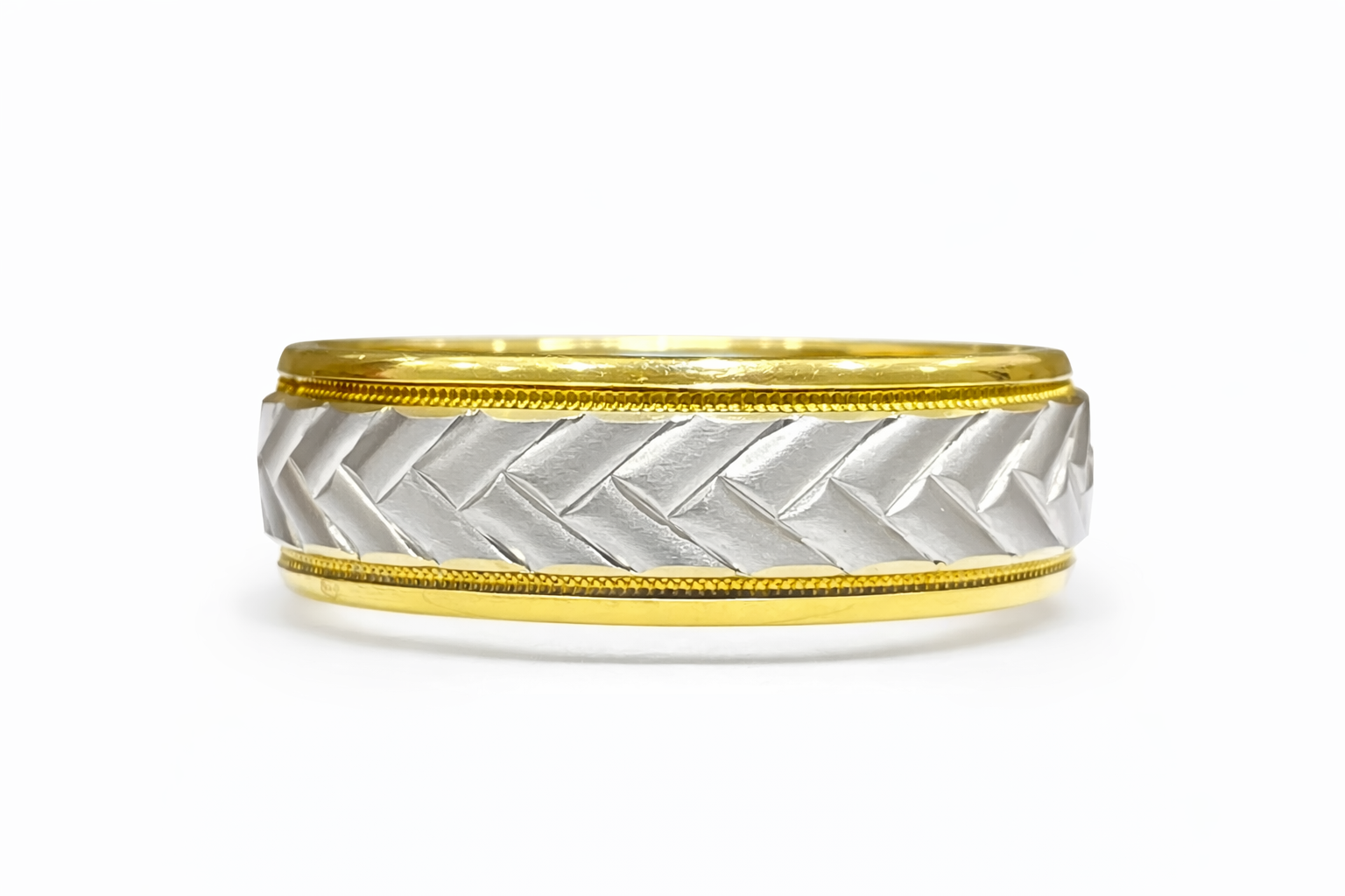 This refined men’s wedding band is crafted in solid 14K true two-tone gold, featuring a beautifully detailed braided center that adds texture and visual interest. The contrasting tones create depth and character, while the intricate milgrain edges frame the design with a timeless, sophisticated finish.