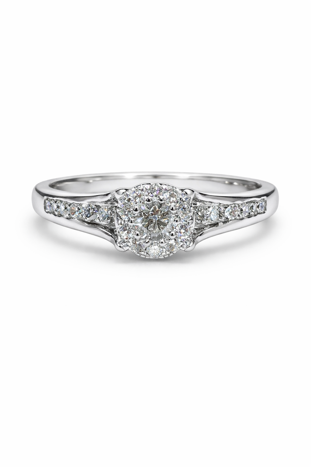 This elegant engagement ring is crafted in luminous 14K white gold and showcases a timeless halo design that enhances brilliance from every angle. A sparkling center diamond is surrounded by a halo of smaller round diamonds, creating the look of a larger centerpiece while maximizing fire and shine.