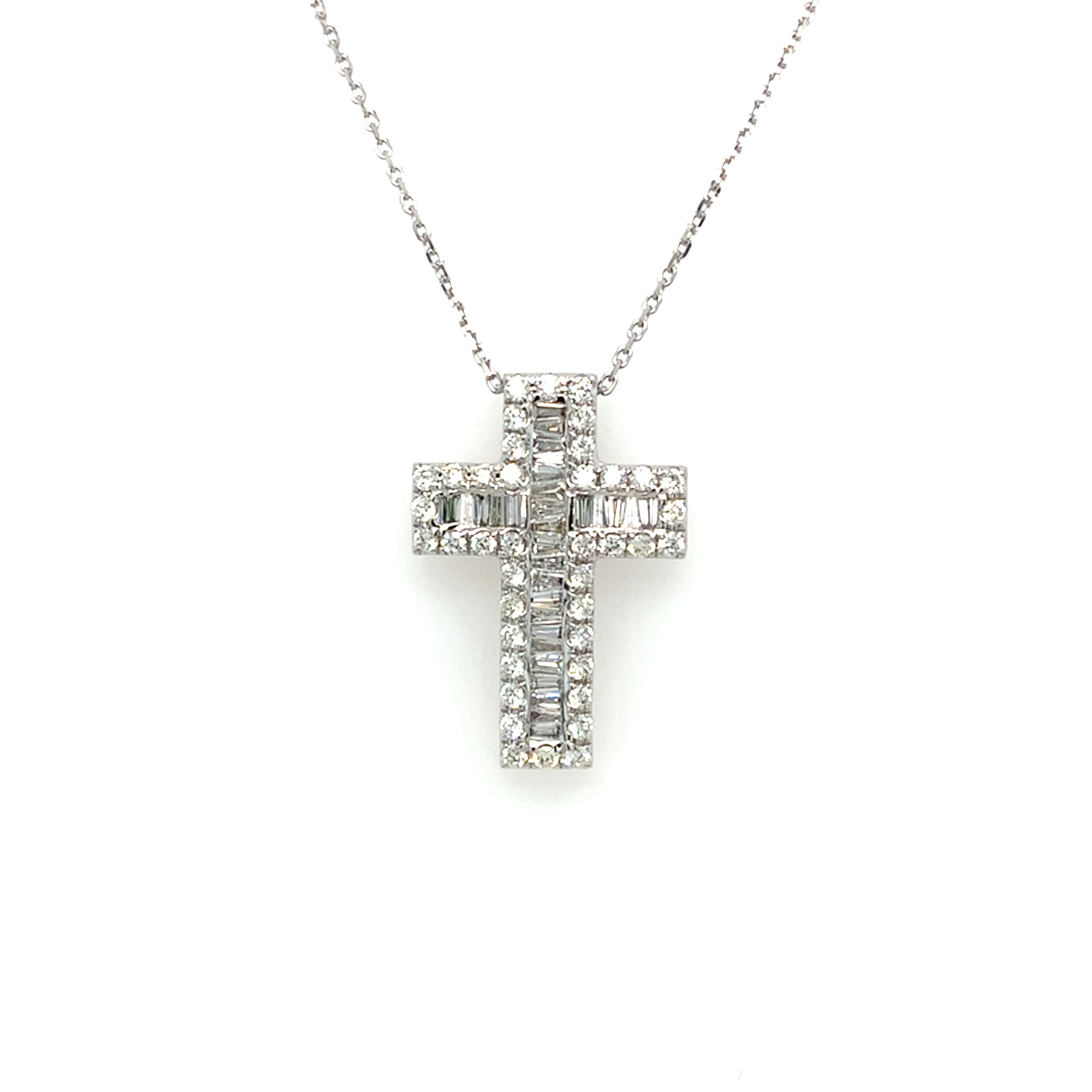 70620 14K WHITE GOLD 1CT BAGUETTE & ROUND DIAMOND CROSS PENDANT SET