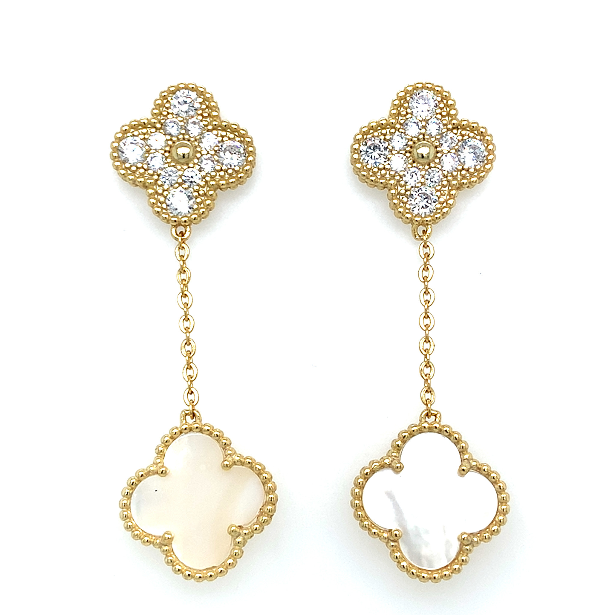 80203 STERLING SILVER GOLD PLATED DOUBLE CLOVER CUBIC ZIRCONIA AND MOTHER OF PEARL HANGING EARRINGS 15MM