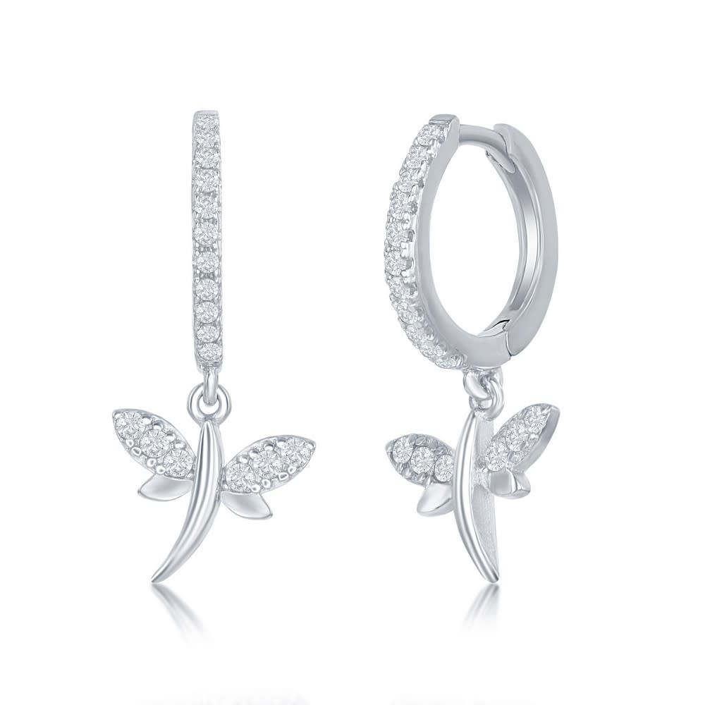 D-7304 Sterling Silver, Small Huggie Hoop CZ Dragonfly Earrings